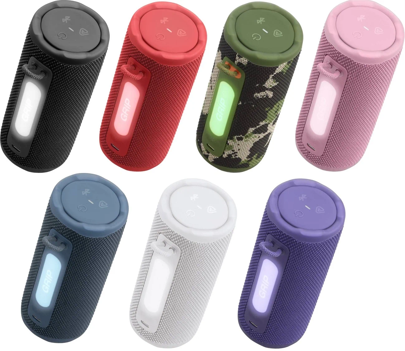 JBL Grip הוא רמקול נייד המספק צליל JBL Pro עוצמתי וכולל תכונות כמו AI Sound Boost, תאורה סביבתית, ועמידות במים, אבק ונפילות.